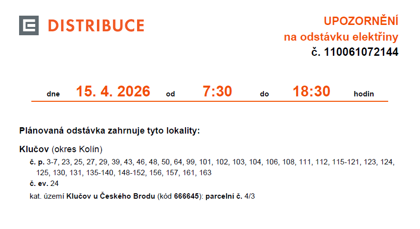 Plánovaná odstávka elektřiny v obci Klučov - 15. dubna
